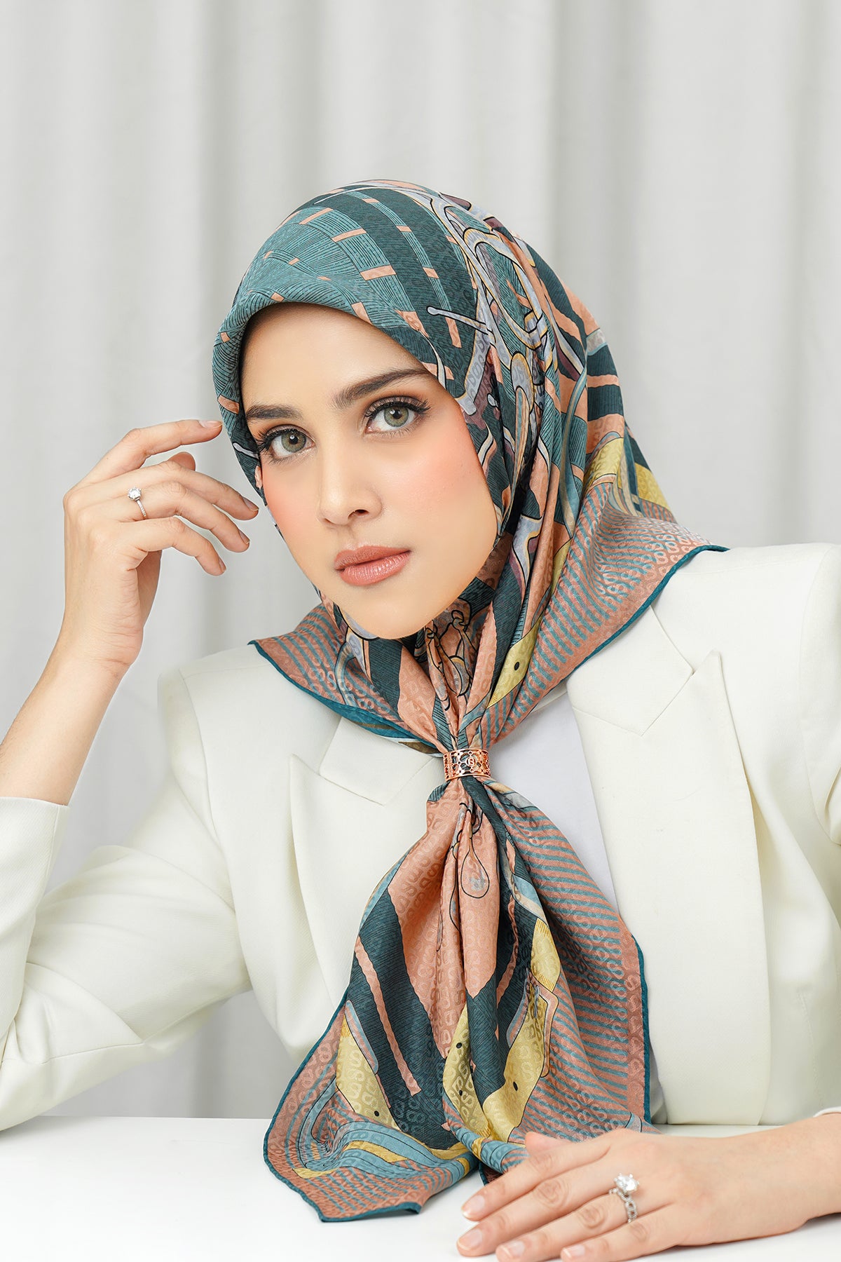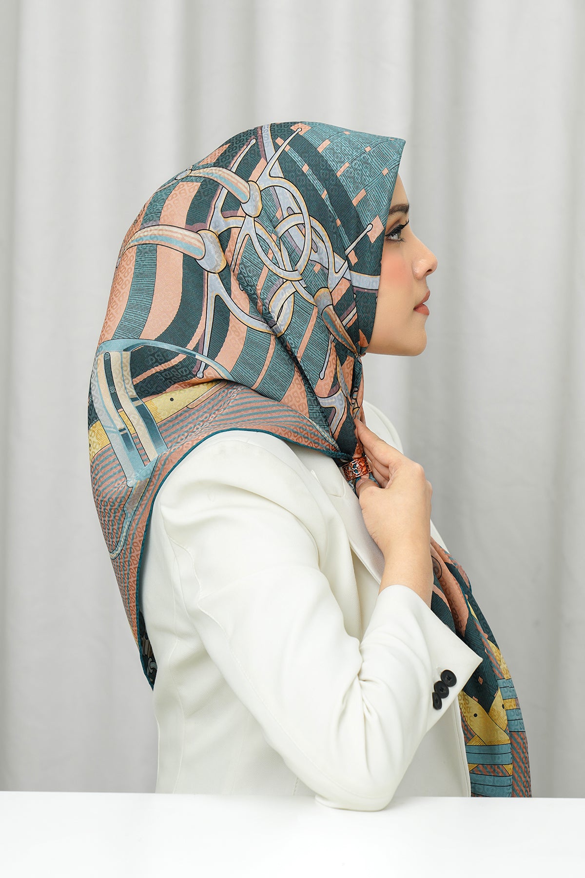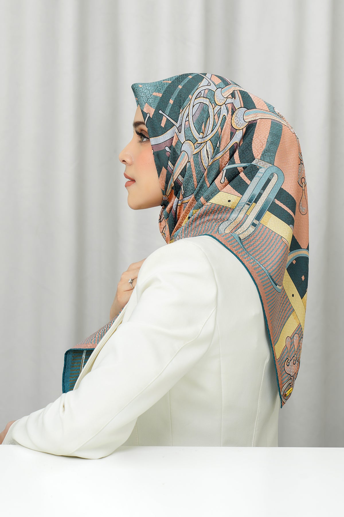 Silk Jacquard Square - Saddle Peach & Blue