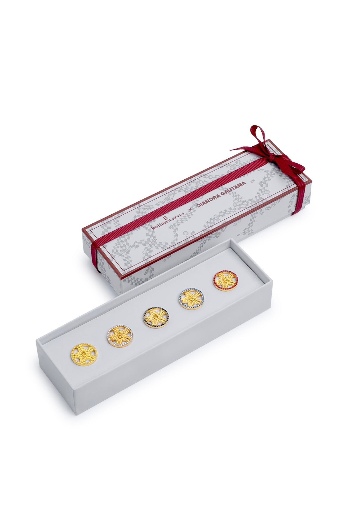 In collaboration with the national woman's racer, Diandra Gautama. This Grand Prix Brooch Set includes 5 beautiful brooches that represent her passion and personality, in the shape of wheels with the signature B logo in the middle.